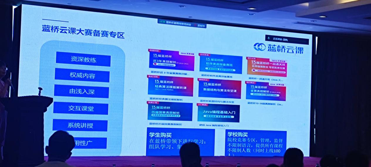 为帮助各参赛院校更好地准备新一届蓝桥杯大赛,促进教师提升竞赛辅导质量,提高院校专业建设和课程教学改革水平。本次特邀蓝桥杯大赛(软件类)专家就第十三届大赛进行总结回顾、近几届(软件类)题型和算法、 选手常见失误分析、竞赛辅导经验等进行重点培训和交流;此外大赛组委会特邀教育部1+X 大数据应用开发(Java)考试项目负责人对产教融合进行介绍,并为参会老师免费搭建蓝桥云课计算机在线实验教学平台。