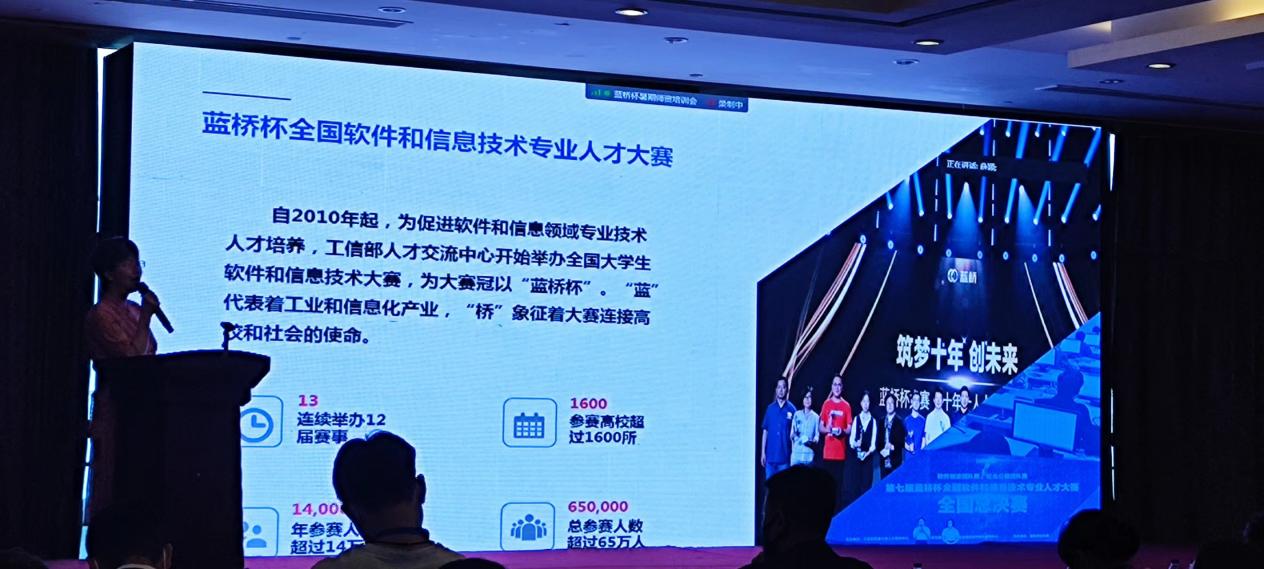 2022年7月25日至7月29日,我们有4位老师参加了由国信蓝桥教育科技股份有限公司和杭州趣海会展服务有限公司承办的蓝桥杯大赛(软件类) 暑期教师集训会。本次师资培训会旨在为建立行业人才选拔标准,搭建软件和信息技术行业人才选拔平台,工业和信息化部人才中心特举办蓝桥杯全国软件和信息技术专业人才大赛。大赛已连续举办十三届,全国1600余所高校积极参与,累计选拔超过60万名优秀的信息技术精英人才。大赛连续三年被纳入中国高等教育学会发布的“全国普通高校学科竞赛排行榜”竞赛项目,并被江苏、四川、甘肃等多个省份列入省级大学生竞赛名录,是检验高校教育教学改革和创新人才培养的重要平台。