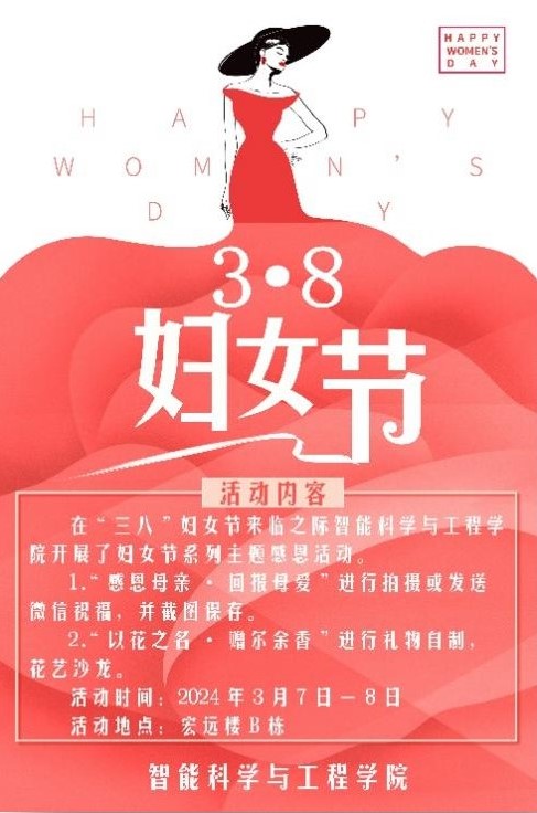 3月7日和3月8日智能科学与工程学院团委于学校宏远楼B102室成功举办了一场别开生面的庆祝活动。本次活动旨在感谢学院女职工们在过去一年里为学院发展作出的无私奉献,并在三八妇女节这一特殊日子里,向她们致以最诚挚的祝福和敬意。