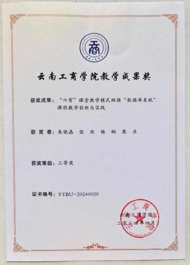 基于以上成果,课程获得云南工商学院两项教学成果三等奖。