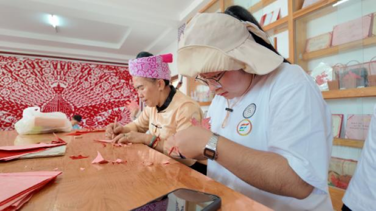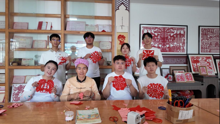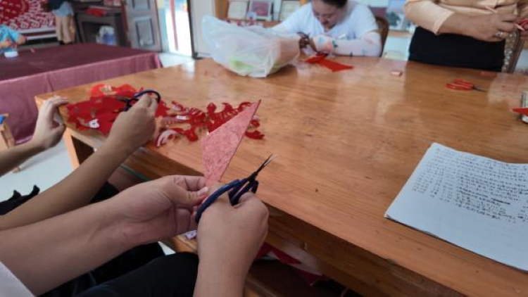 团委书记杨習老师说道:“剪纸不仅仅是技艺的展现,更是情感的寄托和文化的传承。”在户么村的老艺人指导下,团队成员们认真学习如何握剪、如何构思、如何下剪。“咔嚓、咔嚓……”随着剪刀在红纸上的灵活游走,一幅幅精美的剪纸作品逐渐展现在大家眼前。从简单的图案到复杂的场景,每一次尝试都凝聚着同学们对传统文化的敬畏与热爱。