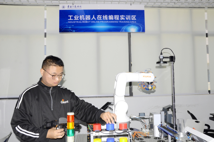 在校期间,李铸辉认真学习专业知识,利用学校的教学实践平台不断增强专业实践能力,在机器人离线编程专业实训室、工程训练中心、校企合作项目中都能看到李铸辉的身影。