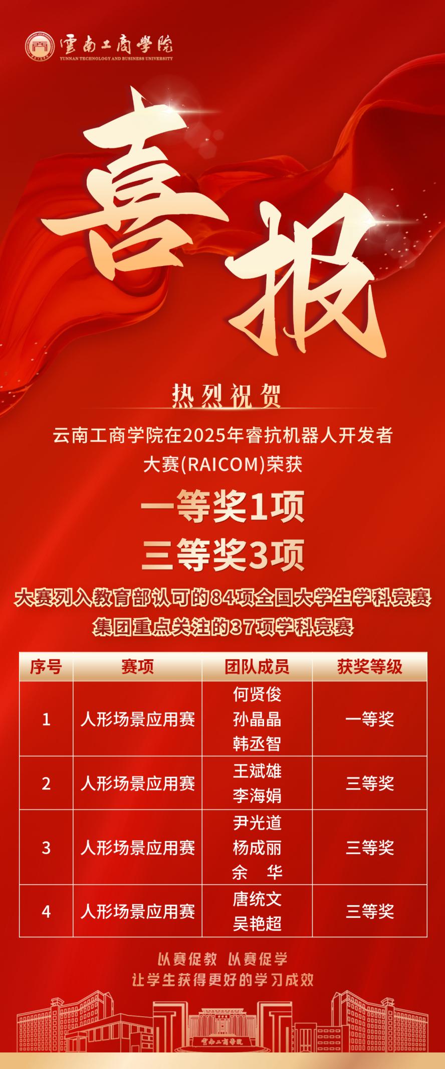云南工商学院智能制造学院用一份亮眼答卷给出答案—— 在2025睿抗机器人开发者大赛(RAICOM)国家级 A 类赛事的“人形场景应用赛”中,学院学子从全国224支晋级队伍中脱颖而出,斩获全国一等奖1项、三等奖3项,且获奖团队全面覆盖机械设计制造及其自动化、电气工程及其自动化、机械电子工程三大核心专业。这份成绩背后,是学院“双师领航、专业协同、以赛促学”的体系化育人实践,生动诠释了本科工程教育“学以致用、知行合一”的育人高度。